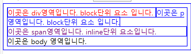 이처럼 div와 p는 block 단위의 요소인것을 볼 수 있다. 여백이 남았음에도 불구하고 해당 블럭 밖에 다음 요소가 위치하는것을 볼 수 있다. span은 inline요소이므로 문자열 단위로 영역이 형성되어 다음 문자열이 바로 옆에 위치함을 볼 수 있다.