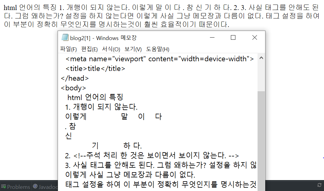 위 코드 실행 결과는 흰 배경이고 메모장은 해당 문서에서 소스보기를 한 결과이다.