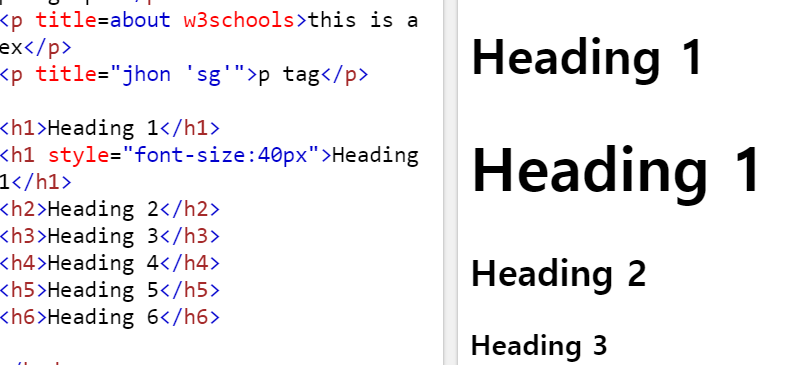 <h1 style=”font-size:40px;”>heading</h1> 이와 같이 작성하면 글씨의 기본 크기가 증가하여 더 큰 h1태그를 볼 수 있다. *여기서 px는 픽셀을 의미한다.