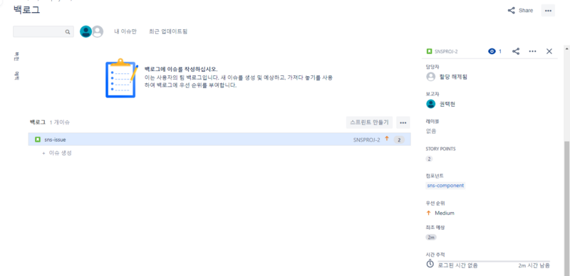 스토리 포인트 부여하고 스프린트를 생성하고 기간을 설정한다.